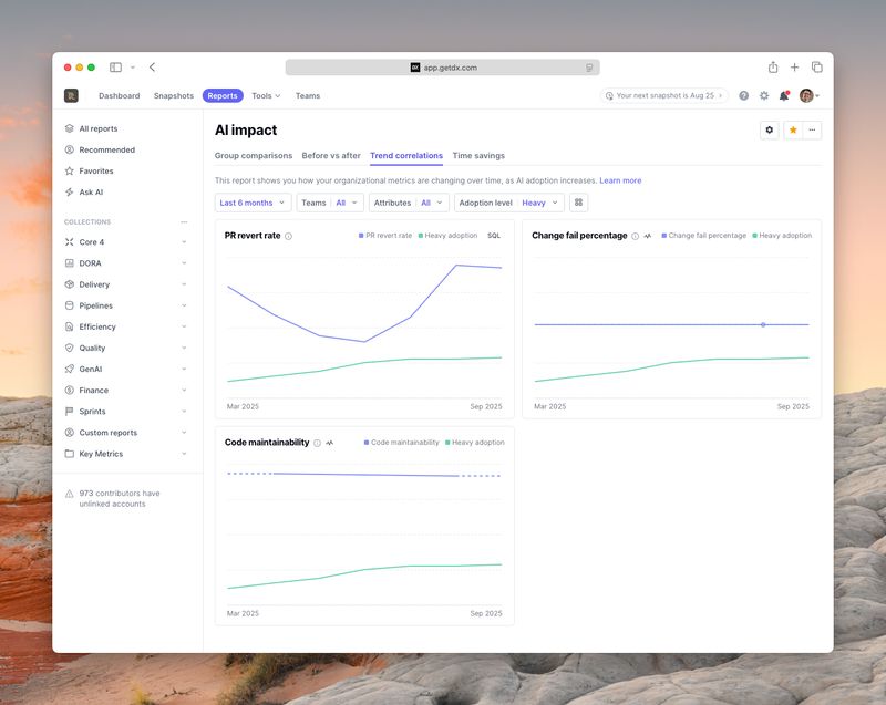 Before diving into the metrics, it’s important to know where to find them in DX. The platform offers three primary views for analyzing AI impact: group comparison, before vs after, and trend correlations.