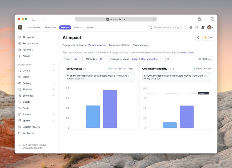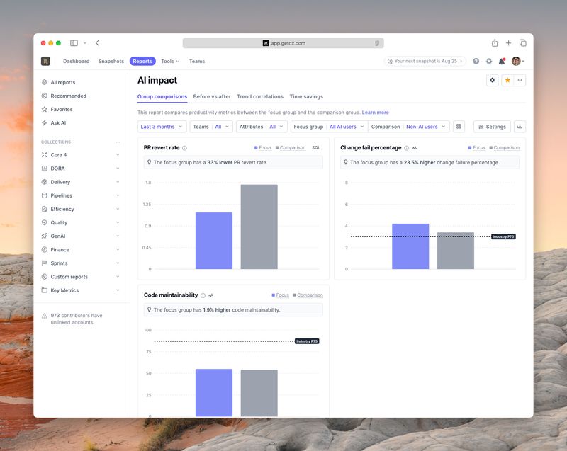 In a recent report from DX’s CTO, 18 companies including GitHub, Dropbox, Atlassian, and Adyen, shared the metrics they’re focused on to measure AI’s impact on developer productivity, which includes measures for quality. In this article, we’ll describe three metrics we see organizations commonly use to measure quality and explain how to view the impact AI is having on these metrics in DX. The three metrics we’ll walk through are change failure rate, pull request revert rate, and code maintainability.