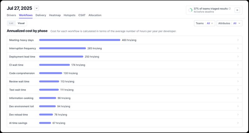 Instead, DORA recommends looking at the system first. Use the Value Stream Management techniques shared by DORA (starting on page 73). If your company uses DX, we’ve made it easy to see bottlenecks across the value stream based on your developer experience data. Anecdotally, I can share that I’ve never come across a company where the incremental time savings from individual task speed-up were greater than any existing bottleneck in the SDLC. Pointing AI at those problems is a great way to unlock a tremendous amount of impact.