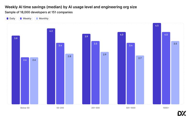 Finally, enterprises continue to lead on AI impact. Engineers at large organisations report saving more time with AI tools than those at startups or smaller companies. However, AI tool adoption within enterprises still lags behind, suggesting there’s untapped potential once adoption catches up.