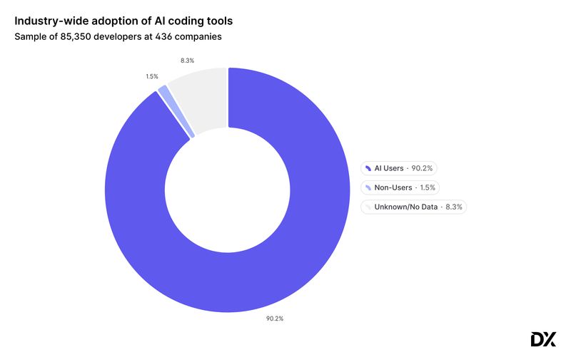 First, AI tool use is now ubiquitous, with over 90% of developers using AI tools at least once a month. Earlier in the year, many leaders focused their AI strategies on adoption and activation, and it’s paid off. But now that adoption has ramped up, the focus needs to shift toward driving real impact.