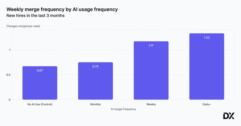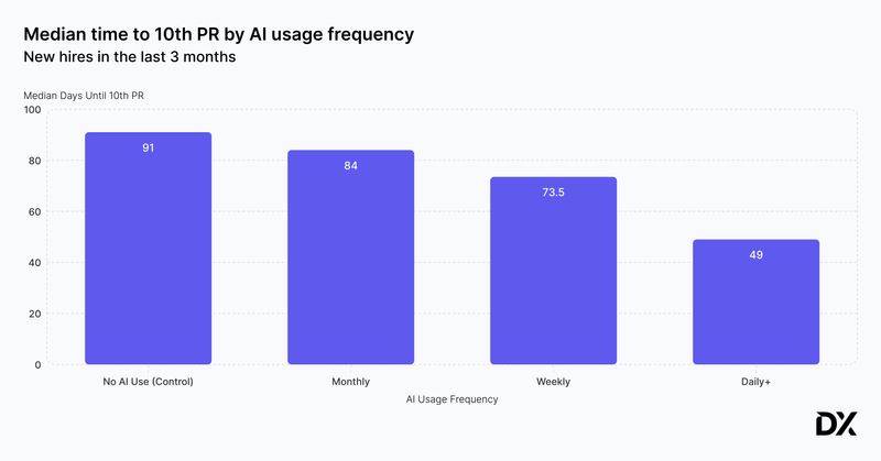 The results were striking: engineers using AI daily hit their 10th PR in just 49 days—nearly half the 91 days it took their peers without AI. Even those using AI less frequently (weekly or monthly as opposed to daily) ramped faster, hitting their 10th PR in 73.5 and 84 days, respectively.