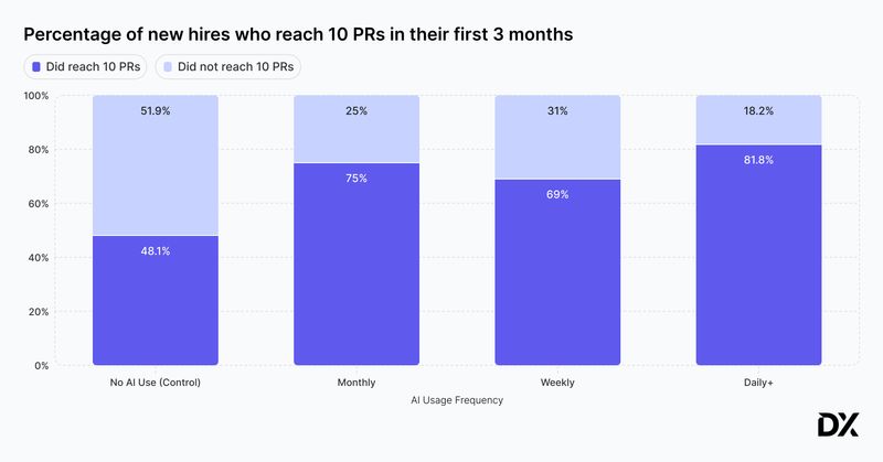 Half of new hires who don’t use AI tools still haven’t reached 10 PRs after 3 months of work. This same measure is less than 20% for new hires with daily AI usage. The trends suggest that AI tools are not just nice-to-have features but genuine accelerators of productivity, both during onboarding and beyond.
