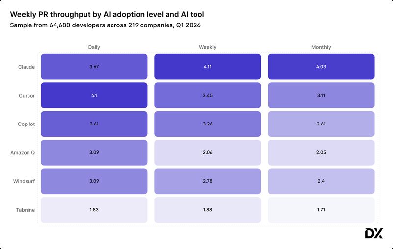AI tooling benchmarks: PR throughput and usage by tool (Q1 2026)
