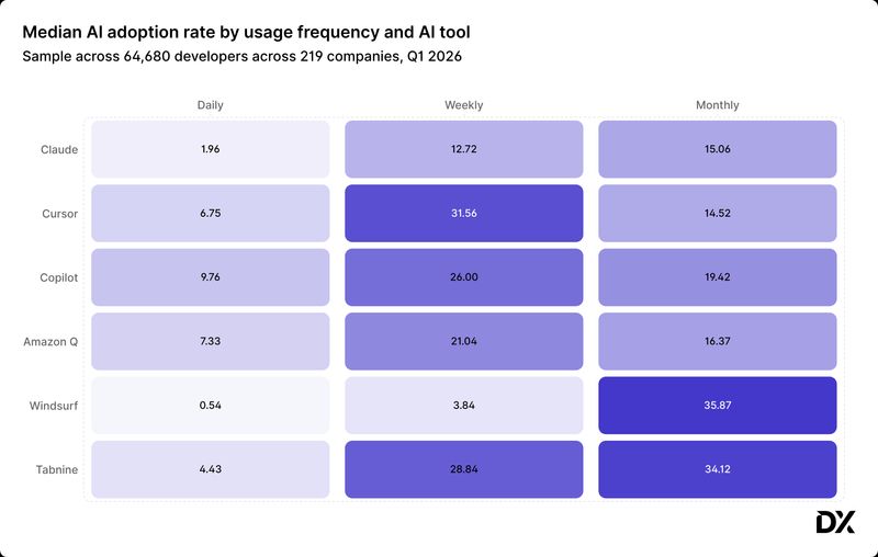 - Windsurf and Tabnine show a longer-tail adoption pattern. Windsurf, in particular, has the highest monthly adoption at 35.87%, suggesting it is being used as a powerful specialized tool for specific complex tasks rather than a total IDE replacement for most.