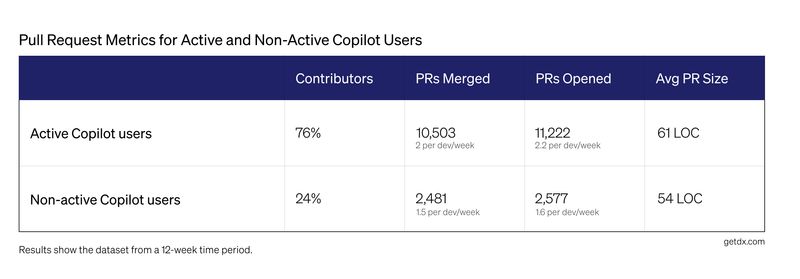 Over a 90-day period, active Copilot users merged 24% more PRs per week than non-users. A 24% lift is big, and the company was thrilled with this result.