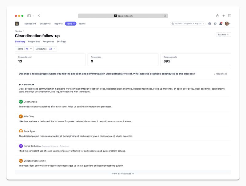 Teams can send a targeted survey (study) to their target recipients by filtering on attributes such as team, role, tool usage, or by uploading a list.
