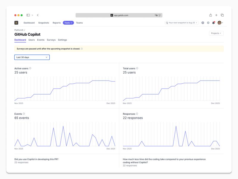 PlatformX is a way to capture in-the-moment insights from developers about internal tools, platforms, and workflows. Teams using this feature set workflow-based triggers to ask developers specific questions. Studies is a way to collect additional feedback from specific developer cohorts, and is often used as a way to dig deeper into problems or questions identified by PlatformX or DX’s Snapshots (periodic surveys). Acme is currently focused on using PlatformX and Studies to capture feedback on AI tools and remote development environments, but they can be used to capture feedback on any internal tool or workflow.