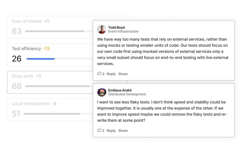 Nearly every company we’ve worked with that previously ran developer experience surveys saw especially low participation within their comments. When leaders treat comments as a “nice to have” or a bonus if a developer responds, they miss an important layer of context that would otherwise guide their decisions. When a survey is designed to strategically capture comments, the result is having the majority of your developer population sharing detailed context about what problems they’re experiencing, when, and how that affects them. This can eliminate the need to run focus groups or interviews to understand what problems developers have.