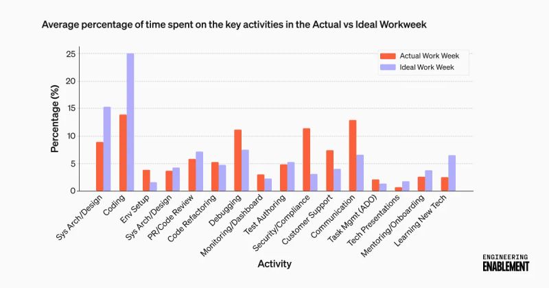 For this study, the researchers surveyed 484 software developers to understand the differences between their ideal and actual workweeks. They identified 16 key activities that comprise a developer’s workweek and measured both the time developers currently spend on each activity and how much time they would ideally allocate to them. Then they analyzed how deviations from the ideal workweek affect productivity and satisfaction, and examined which tasks developers most want to automate with AI.