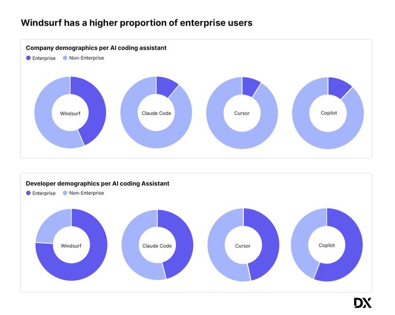 The story is very different for Windsurf, which is taking a strong foothold in the enterprise. In our sample, nearly half of Windsurf’s end-user companies are large organizations, resulting in 65% more enterprise developers using Windsurf than Cursor. For Windsurf, this shows up as a lower PR throughput number. But this isn’t because of tool capabilities; larger orgs are less efficient, so they are starting with a lower PR throughput number.