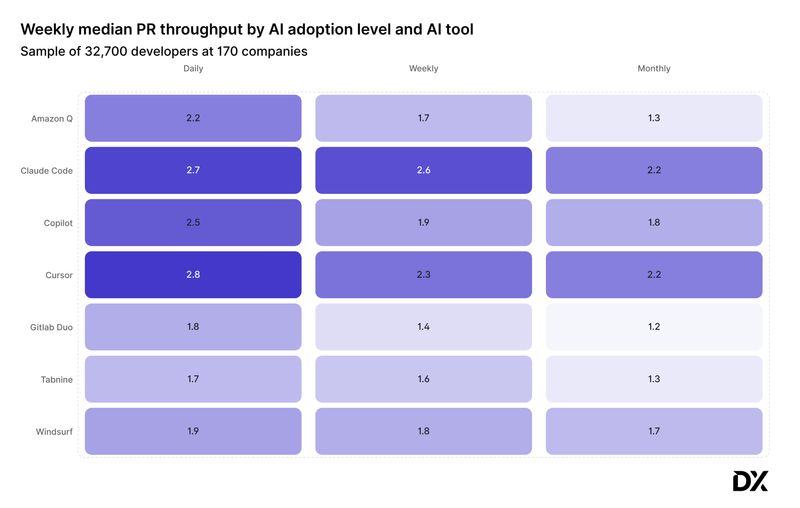 For the second quarter in a row, DX data suggests that newer AI-native tools like Cursor and Claude Code outperform other AI coding assistants when measured by pull request merges per week.