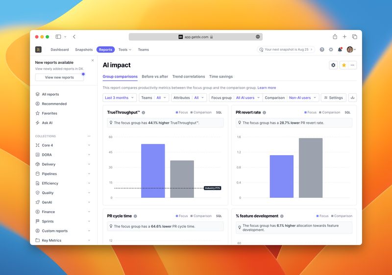 Because DX already captures AI tool usage and its impact, you can compare pre- and post-rollout metrics to evaluate enablement efforts. Filter by team, role, or cohort to guide where you invest next.