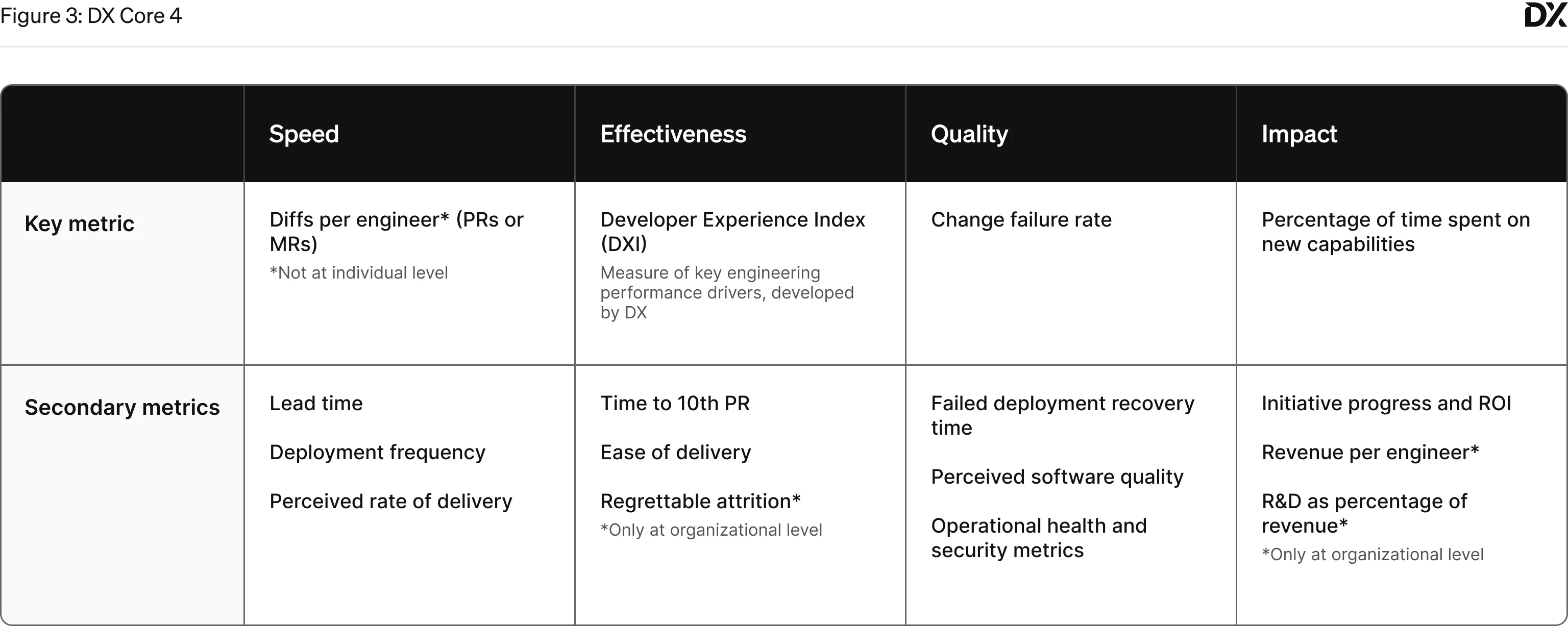 To steer clear of these challenges, it’s critical to frame developer experience within broader engineering productivity and performance measures that executive leaders are familiar with and place importance on. The DX Core 4 framework (Figure 3) is a unified approach that combines DORA, SPACE, and DevEx into a set of standardized metrics. The DX Core 4 helps organizations achieve alignment around developer productivity across the business, leading to faster action and change.