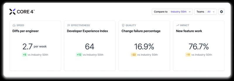 The DX Core 4 is backed by benchmarks from data across 200+ companies in tech, finance, retail, and pharma. Organizations using the DX Core 4 consistently report a 3-12% increase in efficiency, a 14% boost in feature development time, and a 15% improvement in engagement. These benchmarks provide teams with clear alignment on goals and a way to track progress.