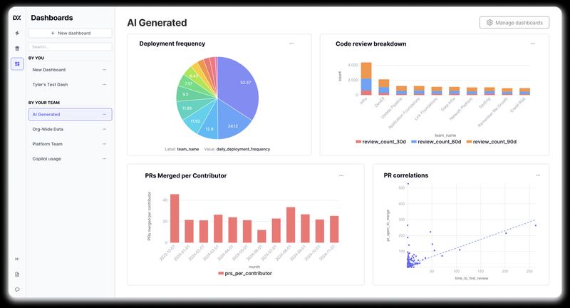 A common challenge with engineering metrics tools is that they don’t allow you to go beyond what’s offered out of the box. DX is unique in offering customers access to their own data lake, along with an AI-powered interface for building custom reports and dashboards.