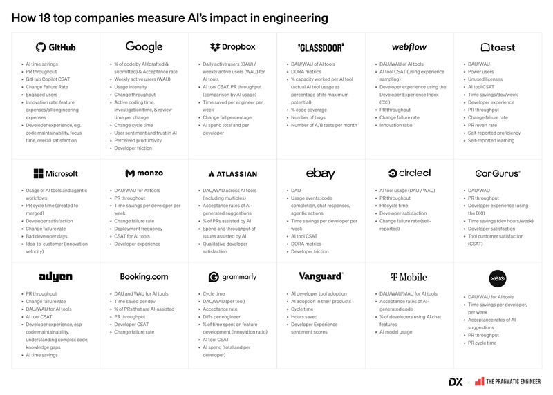 I recently wrote a guest post for The Pragmatic Engineer, where I shared the metrics that 18 companies use to measure AI’s impact on software engineering. Go here the full article, or continue reading for a summary.