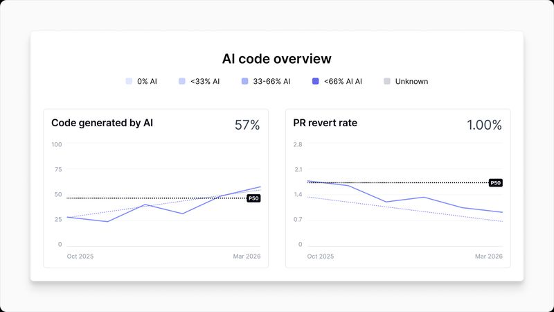 AI-generated code attribution. See exactly which commits and PRs contain AI-generated code. The new AI Code Overview report lets you explore critical SDLC lifecycle metrics bucketed by the percentage of AI in each PR—so you can start to understand how AI-generated code moves through your development process differently than human-written code.