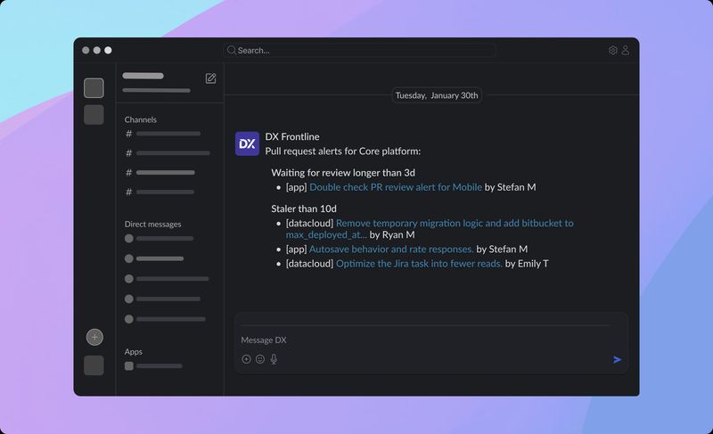 Frontline pulls together data from tools like GitHub and Jira, giving managers a single view of work that’s happening on their team. Seth Nelson, engineering manager at Toast, shares: “I have a large team that makes it challenging to stay on top of work happening in disparate places – DX saves me manual time and effort in knowing the state of my team.”