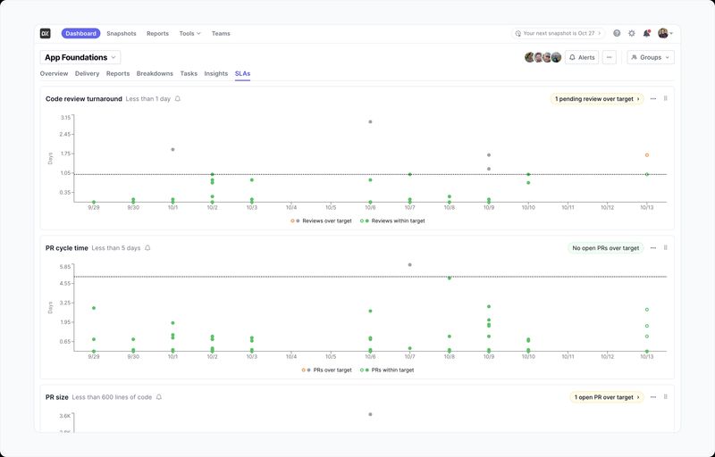 Today, we’re launching Team SLAs—a powerful new approach to track and get notified about how your teams are performing relative to your agreed-upon working commitments. SLAs can be set up for DX groups and flexibly self-managed by team leads, managers, and even developers. They allow you to set up goals around specific performance metrics and see how your team is performing relative to those.