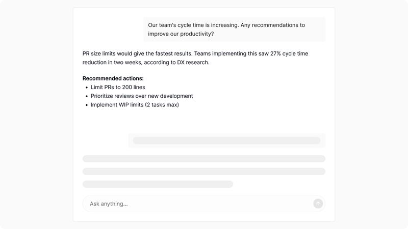 - Recommendations: DX AI is trained on proprietary data from the DX research team, delivering PhD-level guidance on how to remove bottlenecks and improve engineering effectiveness.