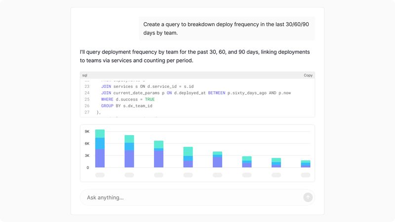 - On-demand analysis: DX AI instantly generates reports and insights to help understand developer productivity, from writing SQL queries to distilling unstructured qualitative data.