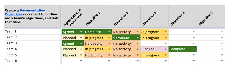 Daniele partners with teams to set quarterly objectives around areas of documentation to improve. He uses a spreadsheet to track all teams’ objectives and progress so that the results of everyone’s efforts can be clearly tracked.