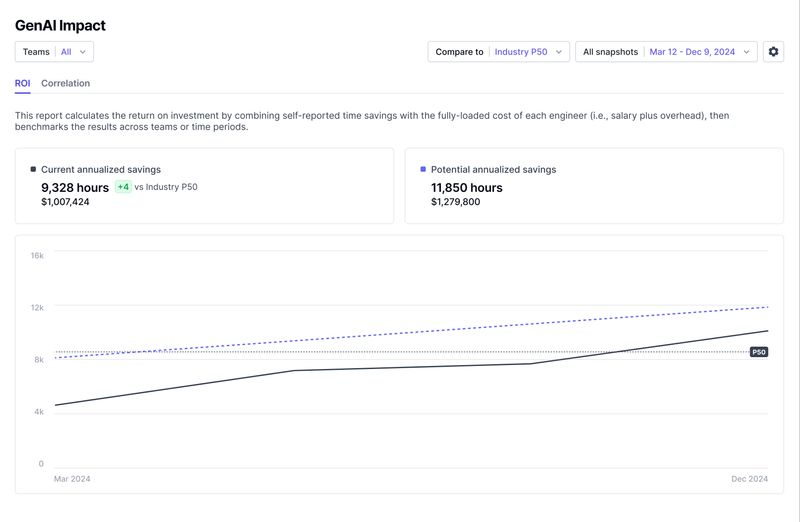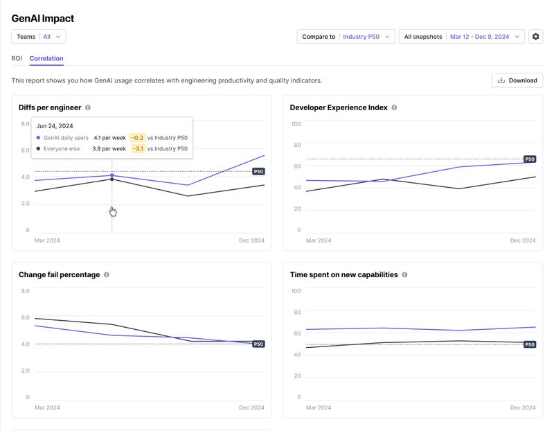 Companies are allocating large budgets toward AI tools, driven by promises of transformational productivity increases. But how can companies quantify these gains themselves and measure the ROI of their AI investments? This guide shares practical tips for evaluating AI’s impact and demonstrates how DX enables you to draw meaningful connections between your investments and productivity metrics.