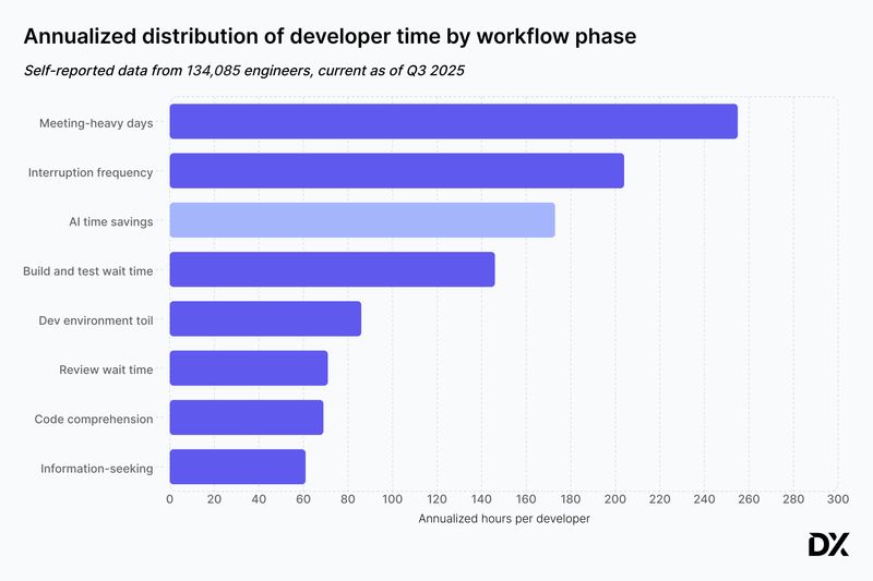 While developers on average report saving 3.35 hours a week with AI, they lose much of those savings to meeting-heavy days, as well as other significant time sinks such as daily interruptions and prerequisites such as code comprehension, information seeking, and Dev environment toil.