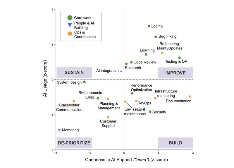 To make these patterns easier to act on, the researchers mapped every task onto a simple chart showing how much developers want AI support (need) versus how much they actually use it today (use). This creates four quadrants that leaders can use as a decision tool: