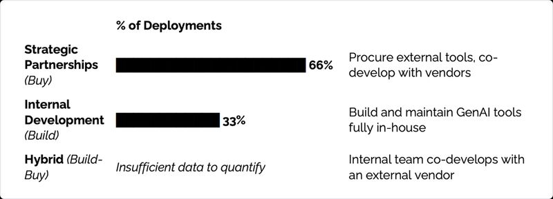 Organizations that crossed the AI Divide approached implementation differently. Rather than building AI systems entirely in-house, they were far more likely to partner with external vendors. Externally sourced tools reached deployment at roughly twice the rate of internal builds, which frequently failed due to brittleness and poor workflow fit.
