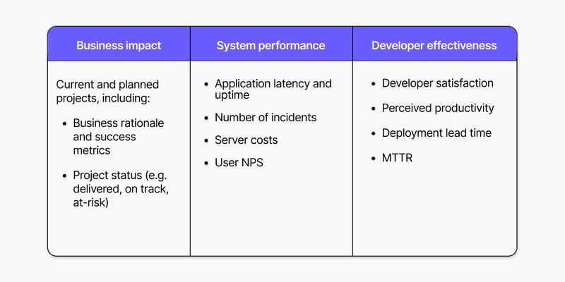 - Developer effectiveness. Developers cost a lot of money, so stakeholders will naturally be interested in knowing how productive developers are, and how developer effectiveness is being improved. If you have a dedicated DevProd or DevEx team, they likely are capturing metrics that fall under this bucket. Models such as SPACE and DORA and the more recent DevEx framework are good to check out.