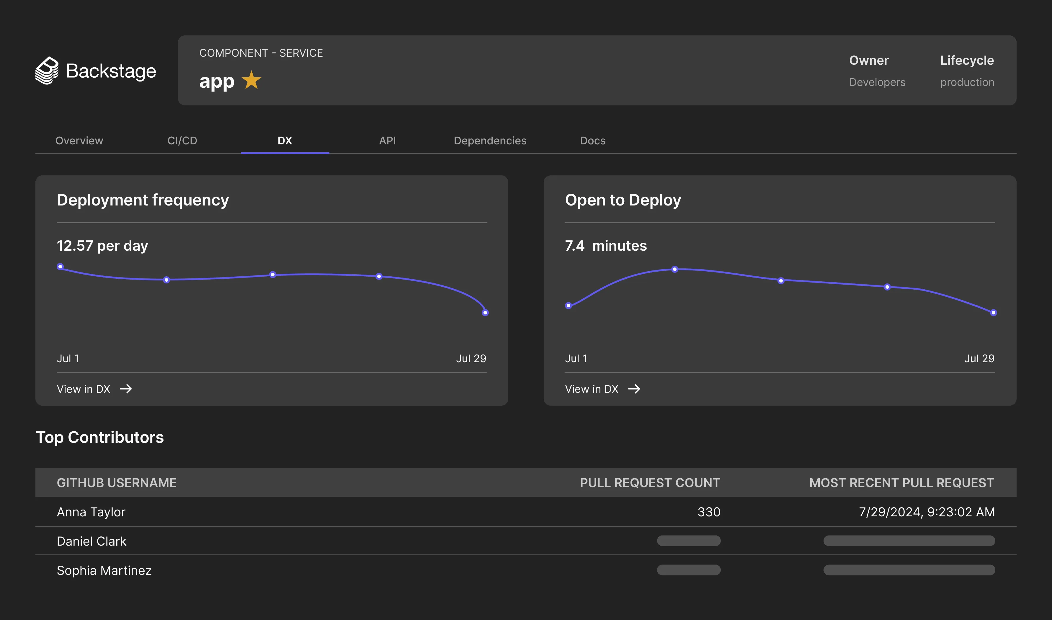 Power reporting, scorecarding, and service intelligence with the DX for Backstage integration.
